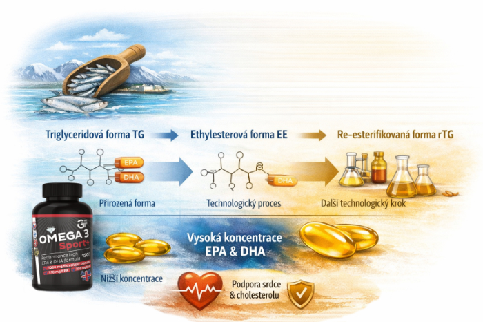V přirozeném rybím oleji jsou omega-3 mastné kyseliny navázány na glycerol ve formě triglyceridů (TG). - Ethylesterová forma (EE) umožňuje dosáhnout výrazně vyššího obsahu EPA a DHA v menší dávce, což je zásadní zejména pro sportovce a fyzicky aktivní jedince.